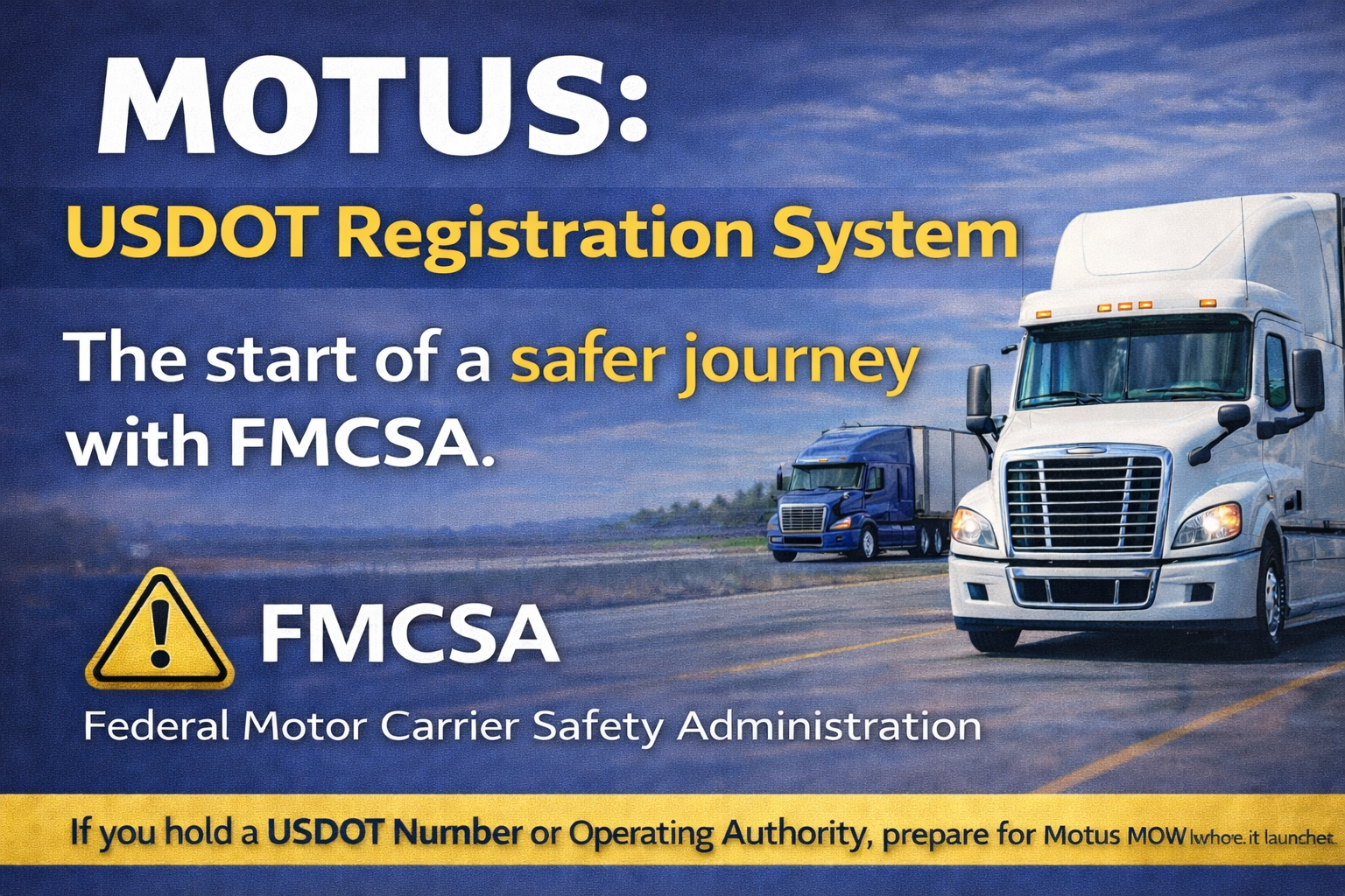 ਨਵੇਂ Motus ਸਿਸਟਮ ਵੱਲ ਬਦਲਾਅ ਨੂੰ ਆਸਾਨ ਬਣਾਉਣ ਲਈ, ਮੋਟਰ ਕੈਰੀਅਰਾਂ ਅਤੇ ਹੋਰ ਰਜਿਸਟਰਡ ਇਕਾਈਆਂ ਨੂੰ ਯਕੀਨੀ ਬਣਾਉਣਾ ਚਾਹੀਦਾ ਹੈ ਕਿ ਉਨ੍ਹਾਂ ਦਾ FMCSA ਪੋਰਟਲ ਅਕਾਊਂਟ ਐਕਟਿਵ ਹੈ, ਸਹੀ ਕੰਪਨੀ ਅਧਿਕਾਰੀ (Company Official) ਦਰਜ ਹੈ, ਅਤੇ ਕਾਰੋਬਾਰੀ ਜਾਣਕਾਰੀ ਅੱਪਡੇਟ ਹੈ।
