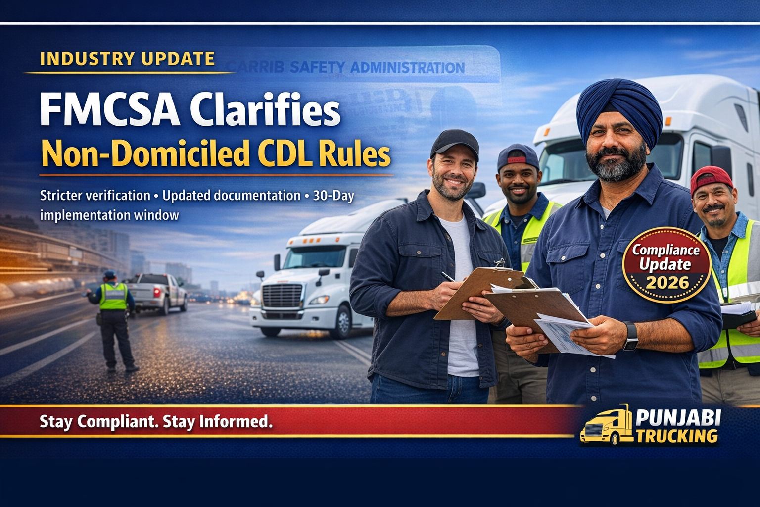 Federal Motor Carrier Safety Administration (FMCSA) ਨੇ non-domiciled CDL ਲਈ ਆਪਣੇ ਫਾਈਨਲ ਰੂਲ ਨੂੰ ਮਜ਼ਬੂਤੀ ਨਾਲ ਲਾਗੂ ਕਰਨ ਲਈ ਨਵੀਂ FAQ ਜਾਰੀ ਕੀਤੀ ਹੈ। ਇਸ ਵਿੱਚ ਗਲਤ ਤਰੀਕੇ ਨਾਲ ਜਾਰੀ ਕੀਤੀਆਂ ਲਾਇਸੈਂਸਾਂ ਨੂੰ ਹਟਾਉਣ ਅਤੇ ਰਾਜਾਂ ਲਈ ਨਵੇਂ ਨਿਯਮ ਦਿੱਤੇ ਗਏ ਹਨ।